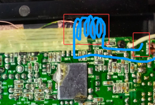 1)电路板大,上面不仅有很长一段铜箔走线,大约15cm,而且有一段软线连接拉杆,大概10cm。软线从红色位置焊接。这样实际上它已经有了一段“天线”,虽然没有拉杆。