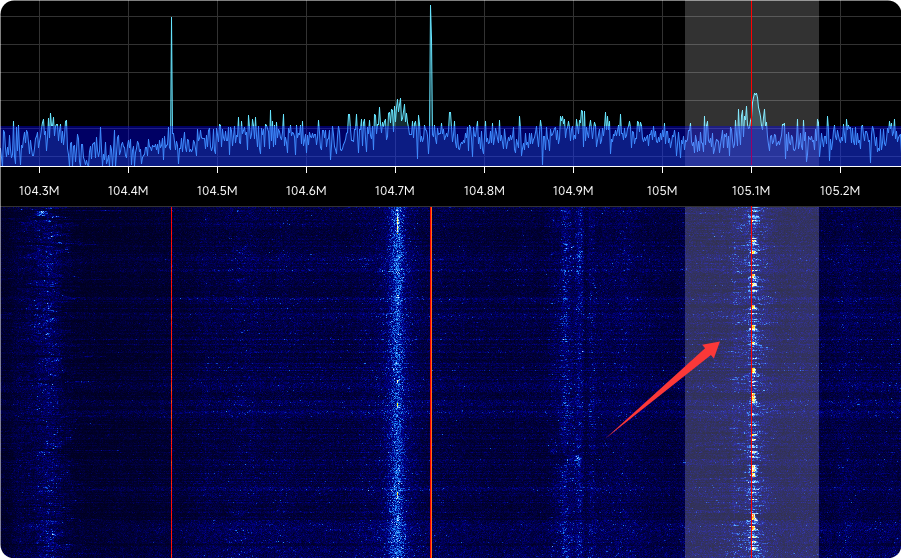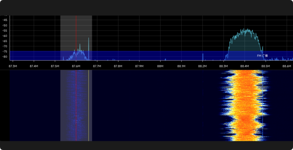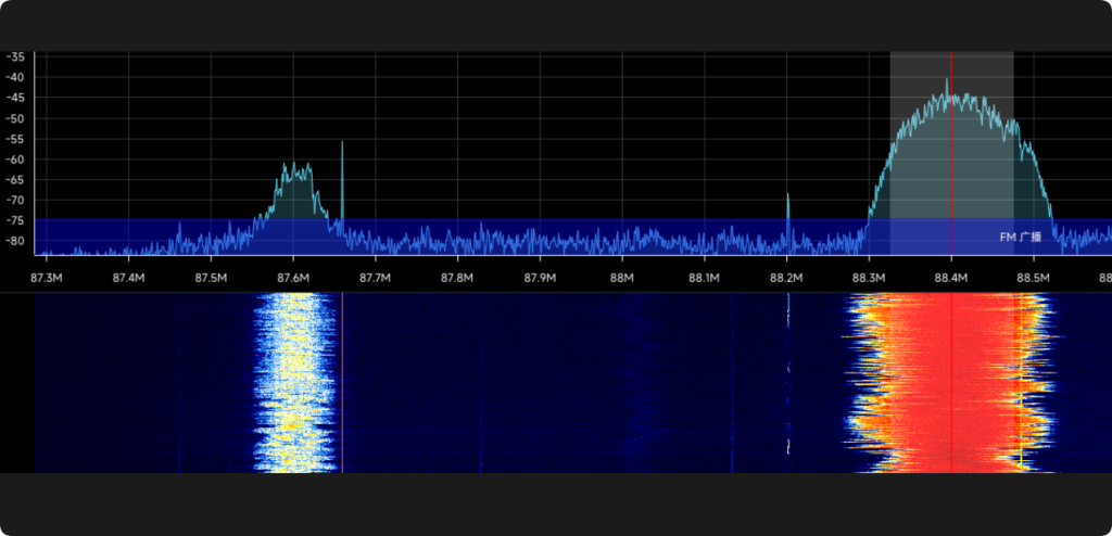 图示小部分为直接接收的强度,上面加上放大器后的效果。