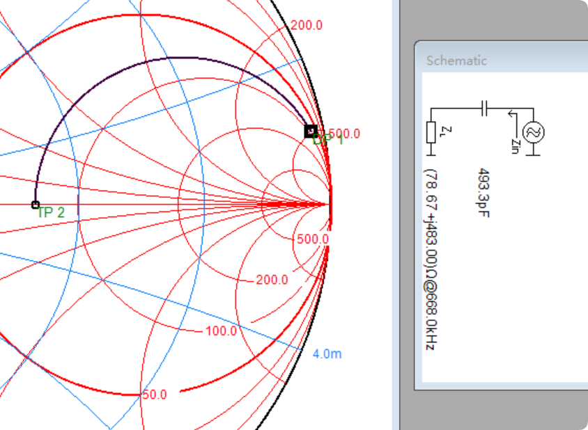 3)先串电容或者串电感到水平线,也就是虚部=0的线上面。再通过纯阻抗变化,到达50欧中心。