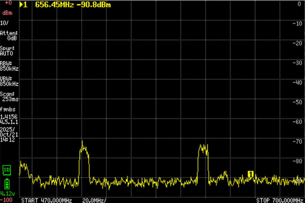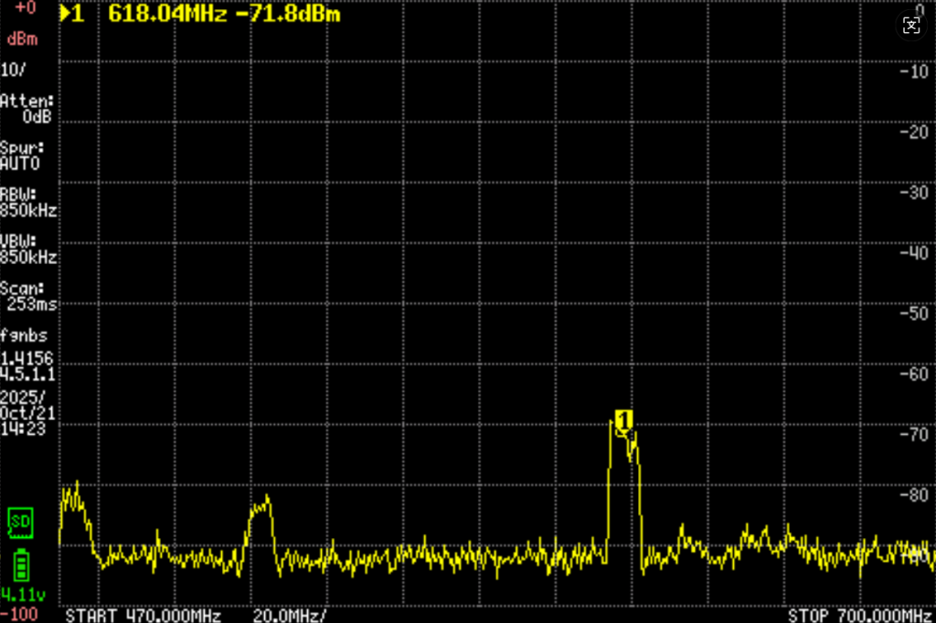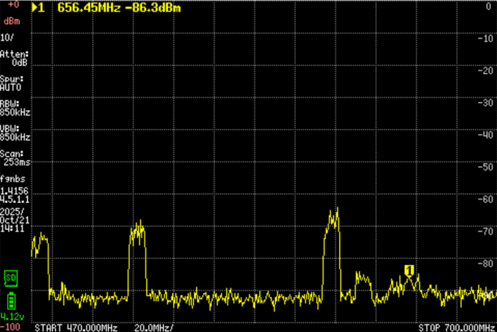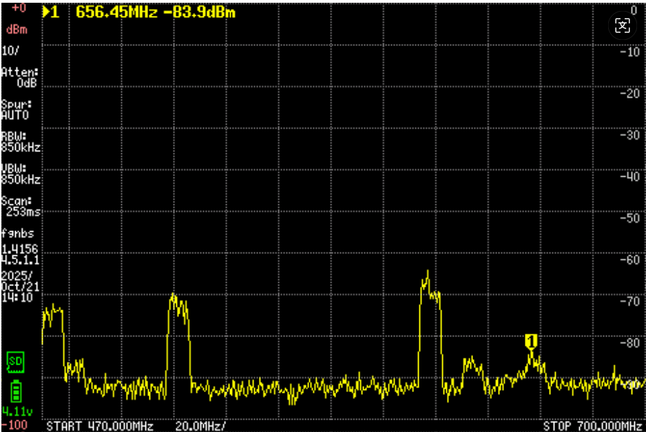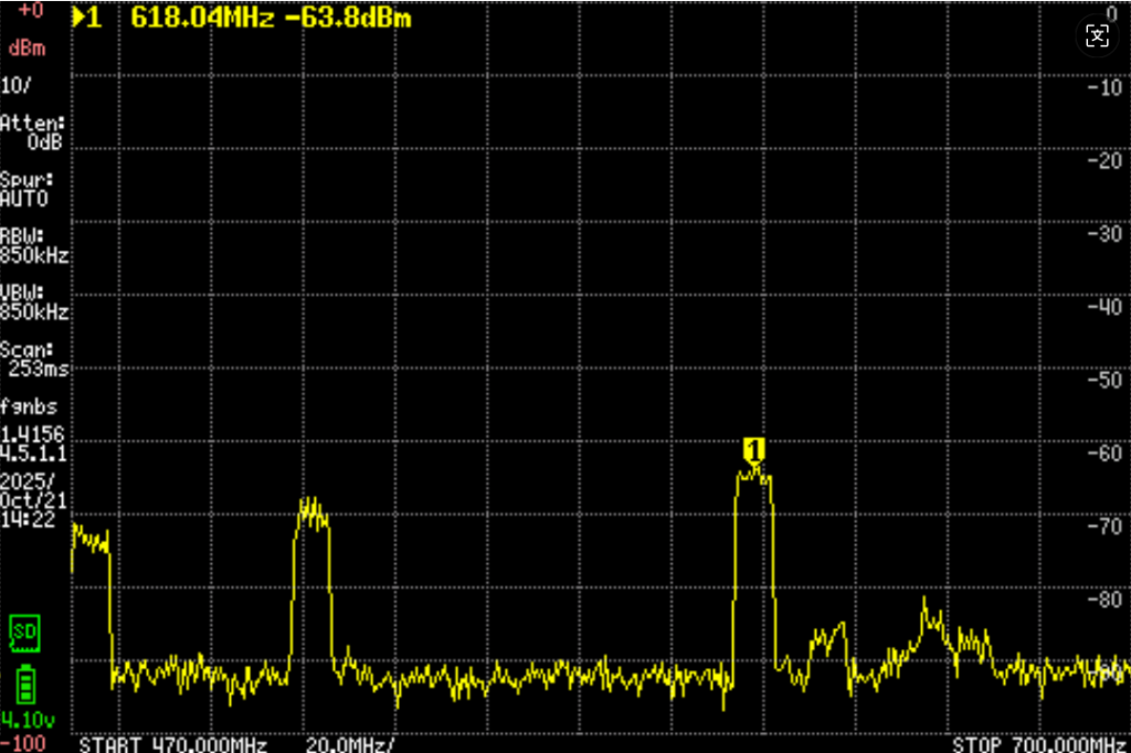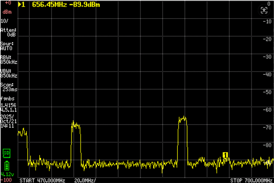 这幅图显示在610之上,有一个比较强,另外还有大概两三个波段。只是方向要非常准,而且很弱。图示看只有-85db。一定要非常多单元的振子外加放大器才行。但是确定有信号。